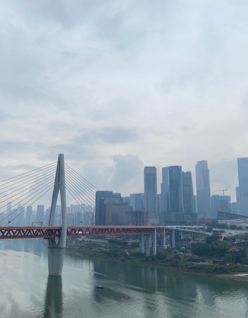 pemandangan kota chongqing dengan sungai yang membelah skyline modern, dipadu jembatan ikonik bergaya cable-stayed yang jadi urat nadi transportasi kota. kontras antara gedung pencakar langit, perbukitan, dan aliran sungai bikin chongqing terasa futuristik tapi tetap natural.